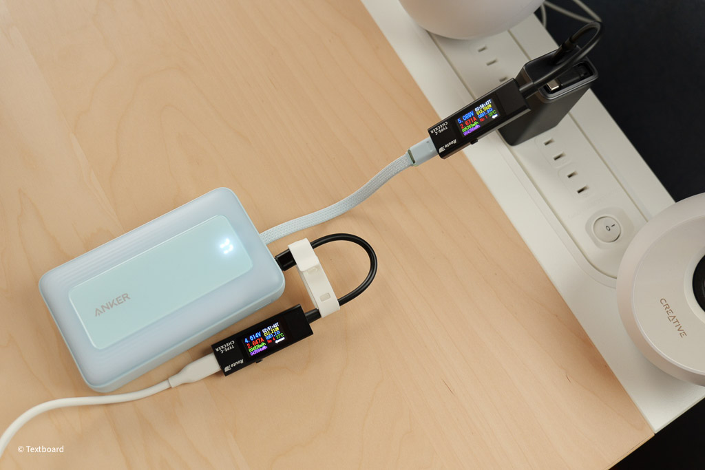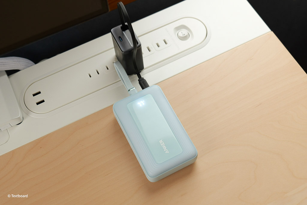 本体充電は入力20Wとなっている。付属のUSB-Cケーブルを充電器に直接挿して充電でき、モバイルバッテリー本体へ充電も、デバイスへの充電もどちらもできる。