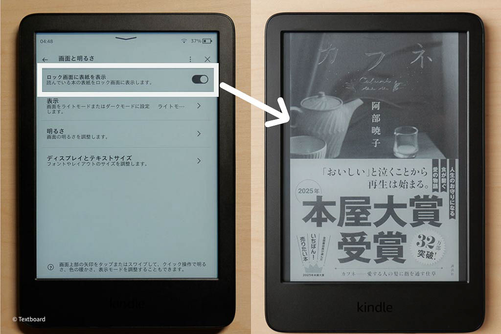 設定 > 画面と明るさ > ロック画面に表紙を表示