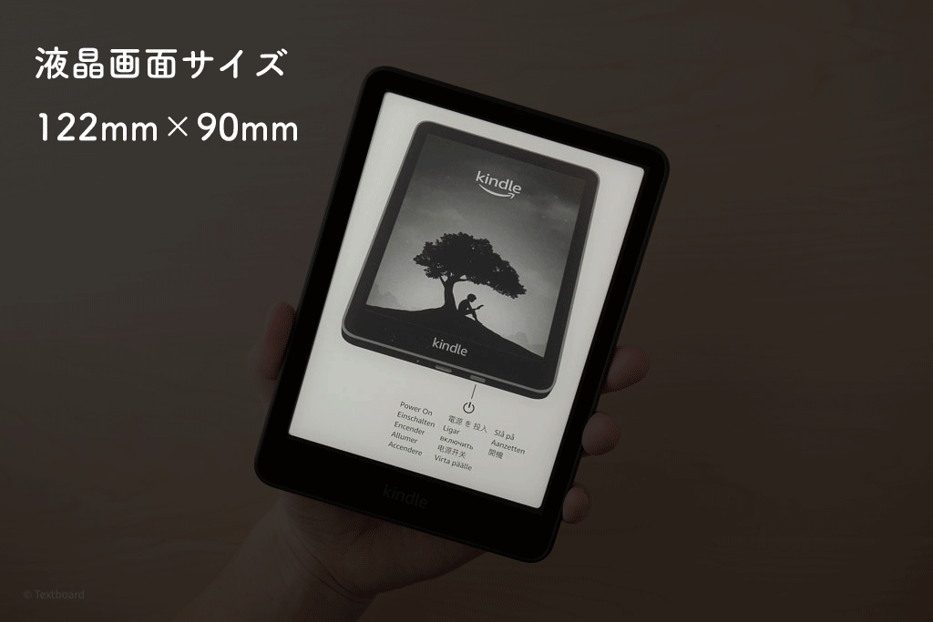 Kindleは片手で掴めるサイズだが、そのまま操作はできないので本体下部を持ち操作するのが使いやすい。液晶画面のサイズは約122mm×90mmです。Kindle本体は文庫本サイズよりちょっと大きい。
