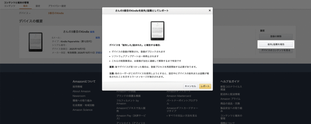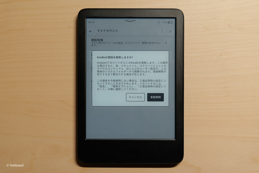 自分のアカウントからこのKindleを削除、紐付けをやめることができる、譲渡したりする場合は工場出荷状態へ戻す。