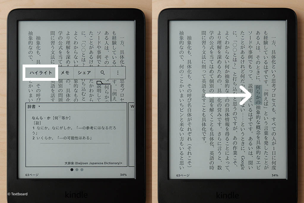 気になった単語を長押しすると、選択できるようになり、ハイライト、メモ、シェアのメニューが出てきます。ハイライトを選択するとその部分がマーカーが引かれます。またこのハイライトした単語や文章にメモを追加できます。