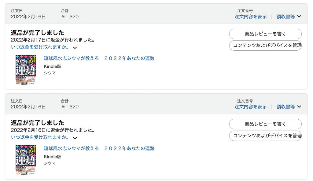 上記は2022年の購入履歴ですが、著者シウマ氏と言う方の電子書籍をなぜか2冊購入していました。記憶にないのでただ間違って購入していたんだと思います。