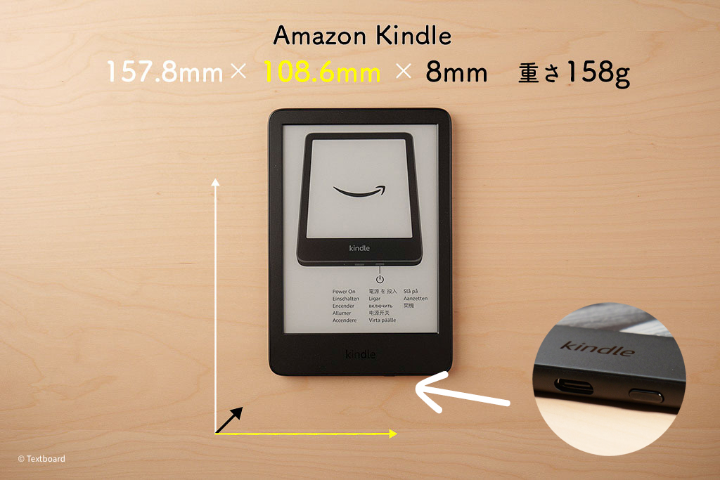 無印のKindleがシリーズの中で、本体が一番小さい。重量も150g台と軽量で片手で持って本を読める軽さ。操作に関しては片手では難しいが本を読む際、両手を使うことが多いと思うので操作は問題ないと思う。