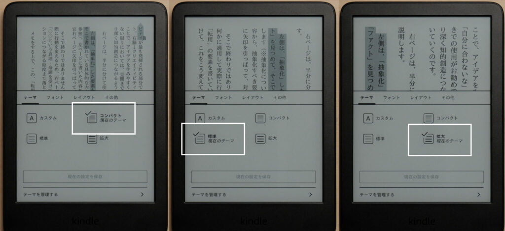 フォントレイアウト設定(Aa)をタップすると上記メニューが表示され、4パターンを切り替えできるようになっている。左から字の大きさがコンパクト(小さい)、標準、拡大の3種類。
