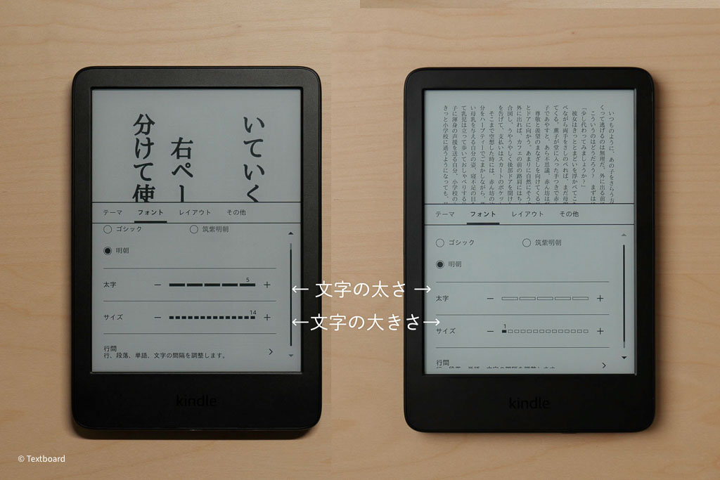 ちなみに字の太さと字の大きさの最大が左の画像、右が文字の最小サイズです。視力によって見えづらい場合でも大きさ変更は細かく調整できる。読書中ピンチアウト、ピンチインで字の大きさを変更することもできます。