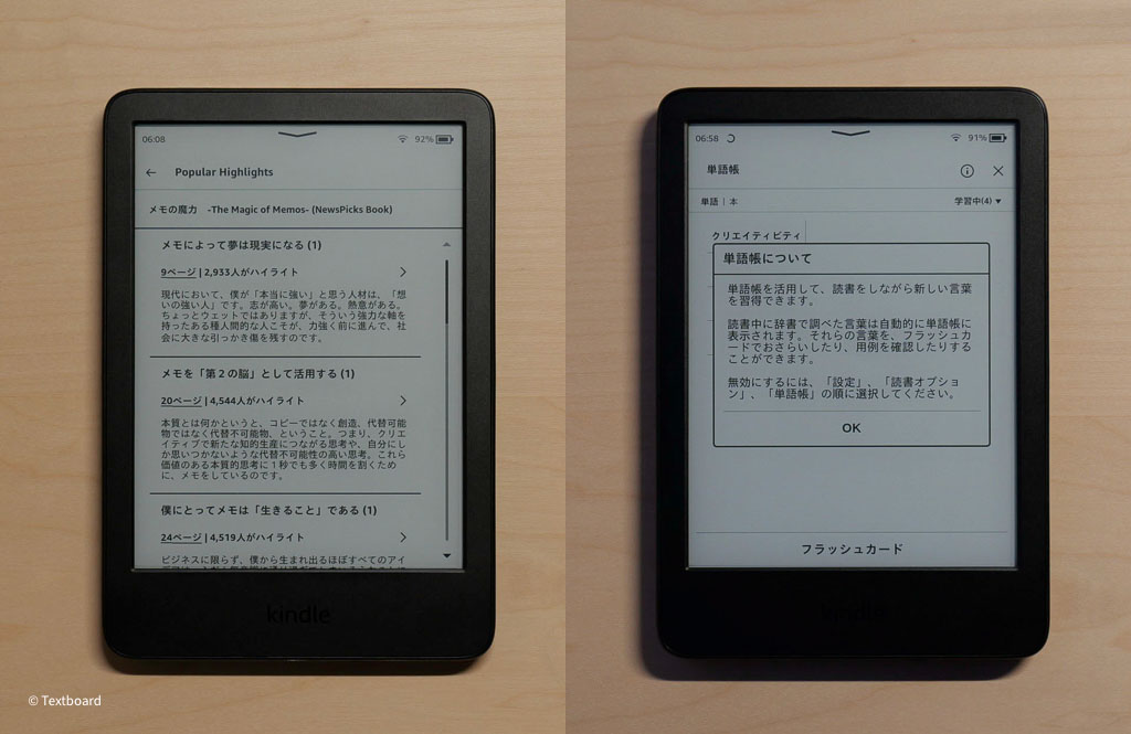 単語帳:読書しながら検索した言葉が単語帳に自動的に記録されます。またフラッシュカードで単語の暗記や勉強に使える機能で、単語帳を開くと削除することもできます。