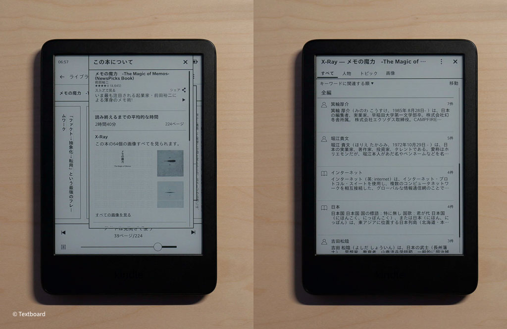 X-Ray:Kindleで読んでいる本全体の「骨組み」を表示する機能です。本に登場する人物、場所、話題、用語などがリストで整理されており、ストーリーの流れを把握するのに便利です。また、本の抜粋画像が、タイムラインに沿ってデジタルカード形式で表示され、ぱらぱらとめくる感覚で全体を流し読みすることもできます(対応する本のみ)。About Amazonより引用