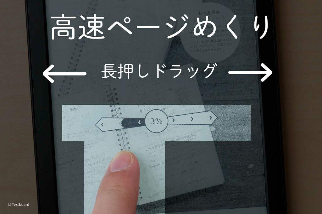読書中に画面を長押し左右にドラッグすることで、高速でページをめくる事ができます。