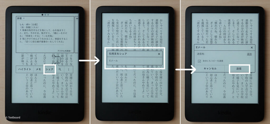 気になる文章や単語をを長押し、シェアをタップすると引用文をシェアからEメールを選択後、送信先を決めて送信で完了となります。