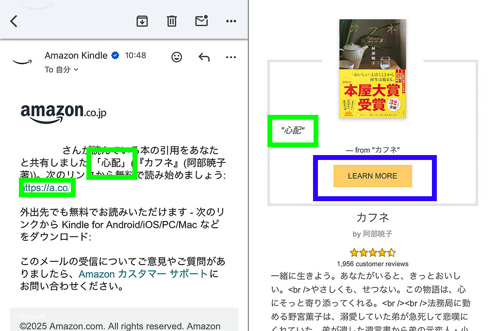 シェア機能で送信すると左画像が送られてきたメールになります。緑の枠の「心配」が共有されます。またその下の緑枠のURLをタップすると、右画像のAmazonのページを開きます。この画面にも共有された単語や文章が表示されています。青枠のLEARN MOREをタップするとAmazonの購入ページが開きます。
