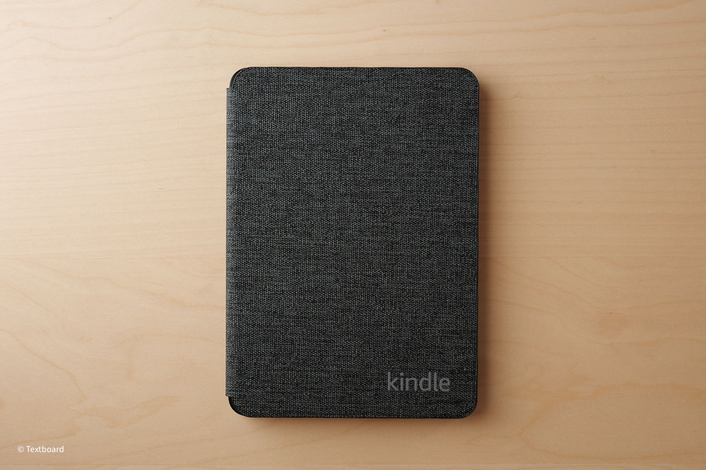 素材はファブリックで質感はとてもいいです。表の蓋右下にKindleとシリコンぽい素材で印字があります。個人的にはこれはない方がいいと感じた。