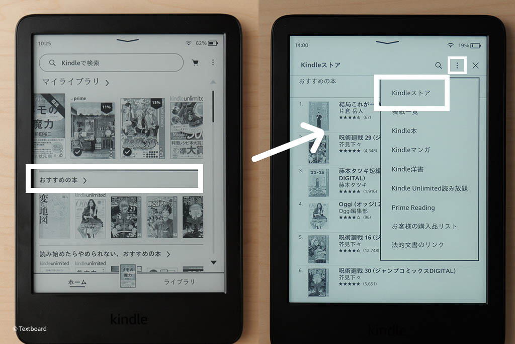 2つ目はホームでおすすめされている、「おすすめの本」など項目をタップすることでストアに入れますが、Kindleストアトップにアクセスするには、上部3点マークの中のKindleストアをタップしストアトップへ。
