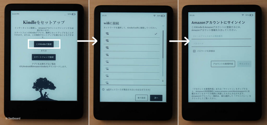 - セットアップの選択、このKindleで設定 or スマートフォンで設定、ここでは「このKindleで設定」を使用します。次に使用しているwifiを選びパスワードを入力し次へ。