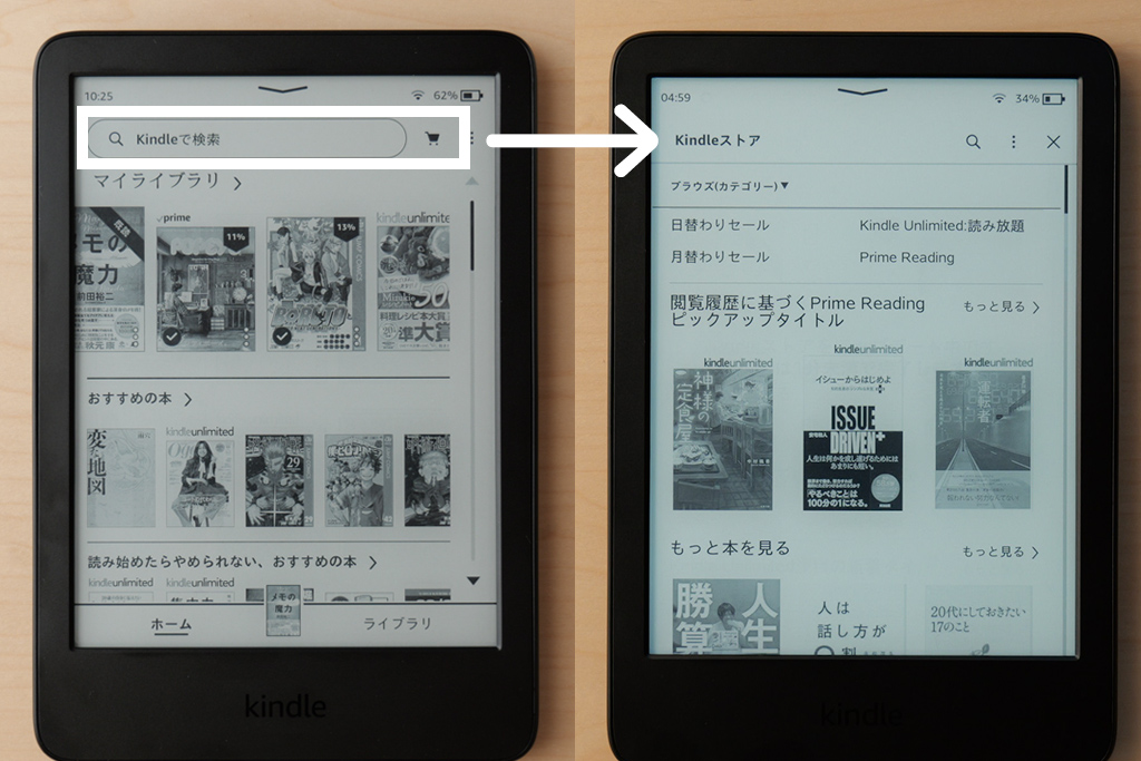 1つ目は上部のカートのロゴを押すことでKindleストアトップが表示されるのでおすすめです。ホーム画面、ライブラリ画面上部の、検索窓から検索するとKindleストア内の本と、ライブラリの本が検索れます。