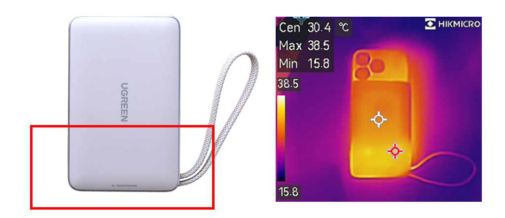 温度も約40℃が上限でそこまで高温にならず使いやすい、発熱する箇所(画像の赤四角)が上下ではっきり分かれているのが意外だった。全体的に熱を逃がせればもっと低くなるんじゃないかと感じた。