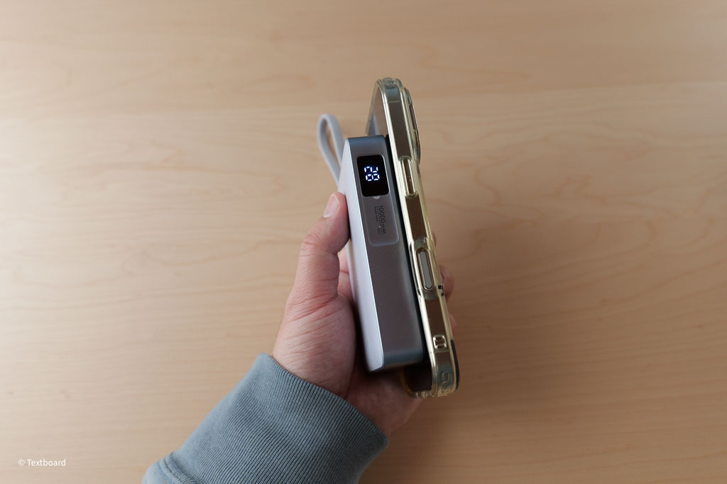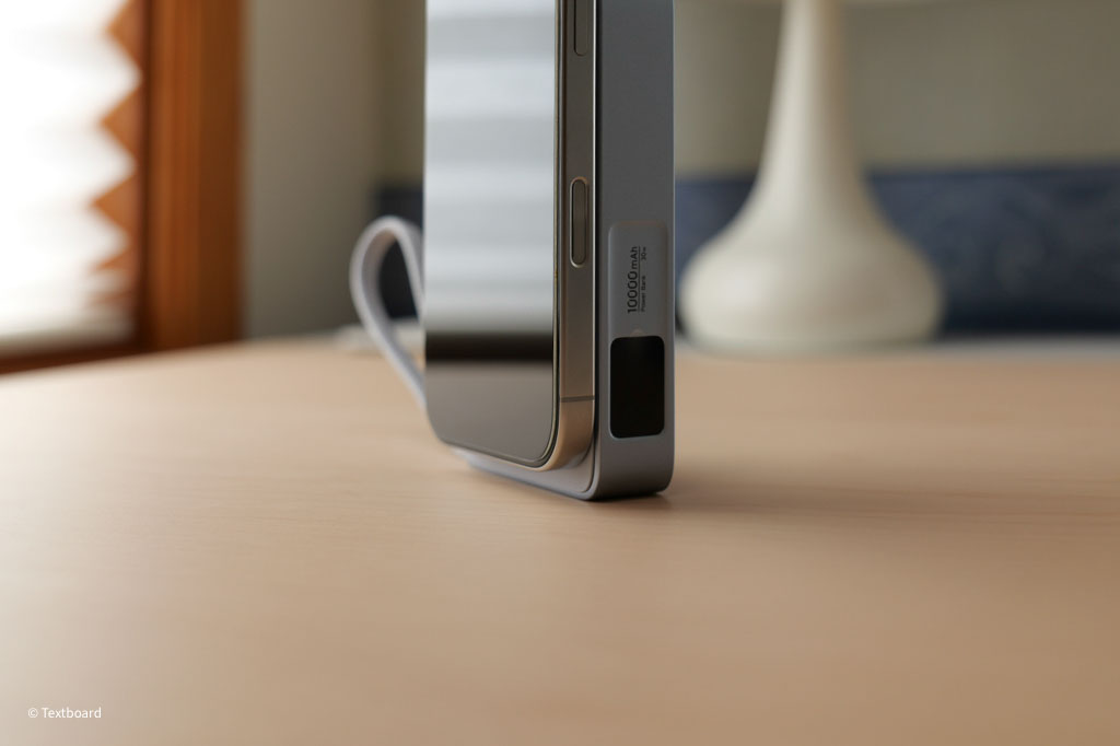 モバイルバッテリー本体が大きく、iPhone16Proに取り付けるとモバイルバッテリー下部がiPhoneから少しはみ出るサイズ。iPhoneのケースを取り付けていない状態だと立てる事ができるが不安定。