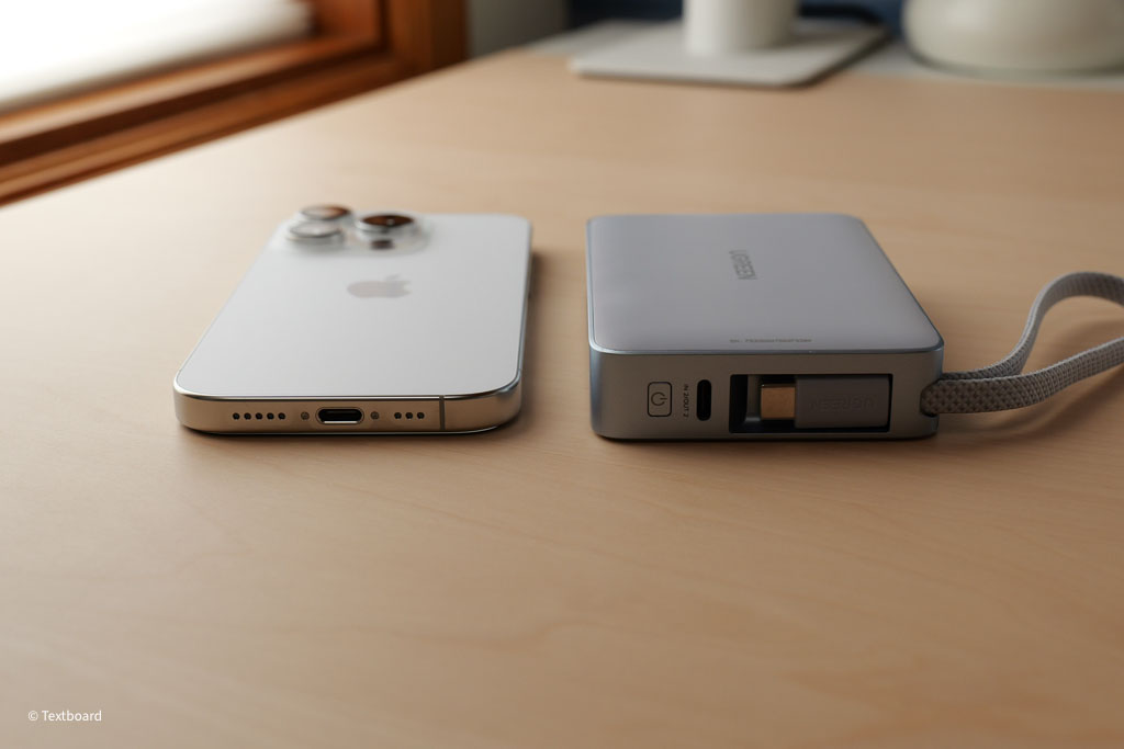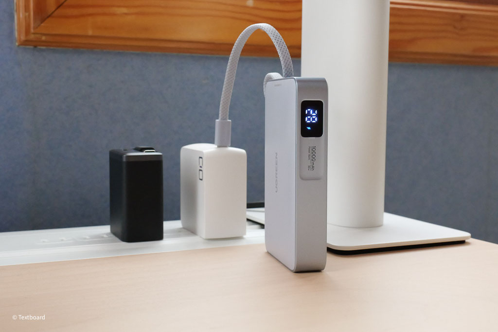 一体型ケーブルは入力と出力どちらにも対応している。この機能は本当におすすめで、上記画像のように充電器のUSB-Cポートにモバイルバッテリー側のケーブルを挿すだけで、別途ケーブルを用意する必要なくモバイルバッテリー本体へ充電できる。デスク上などスッキリしておすすめです。
