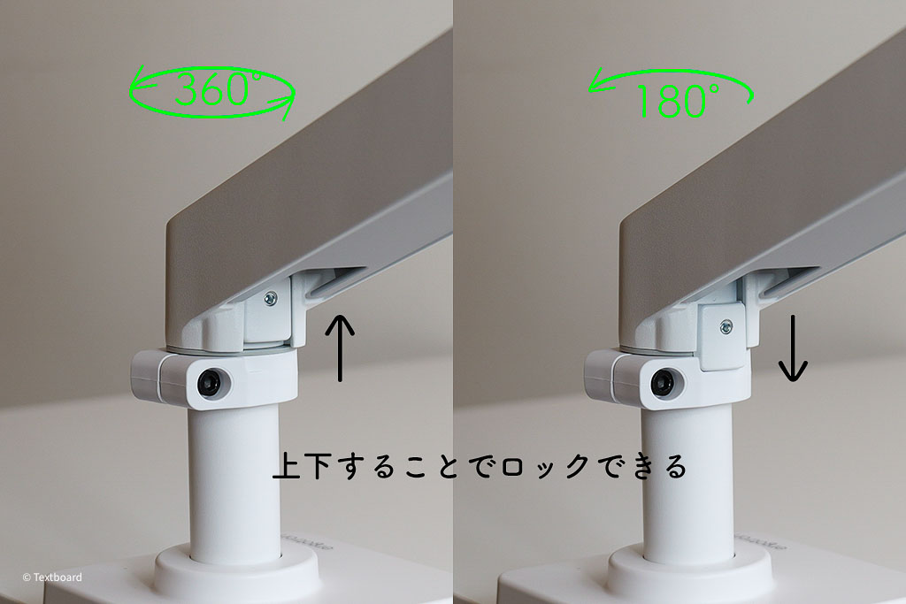 下アームは上下できるパーツがあり、六角ネジで固定できるようになっていて回転を180°か360°回転か選べるようになっている。