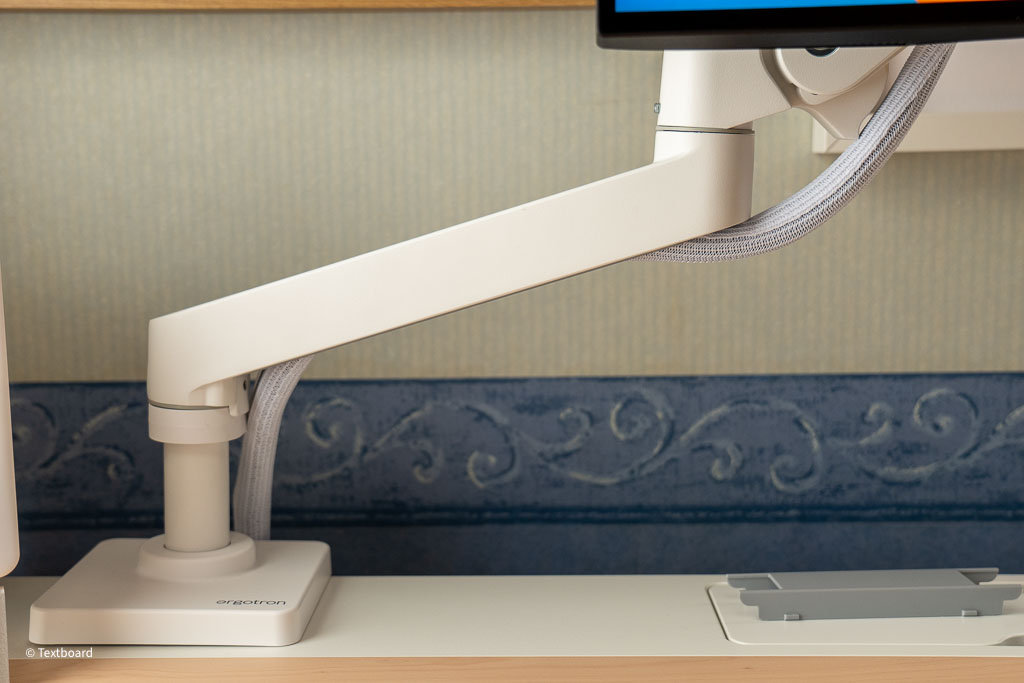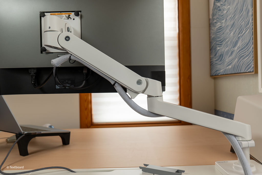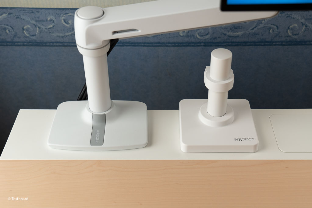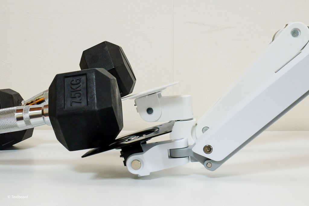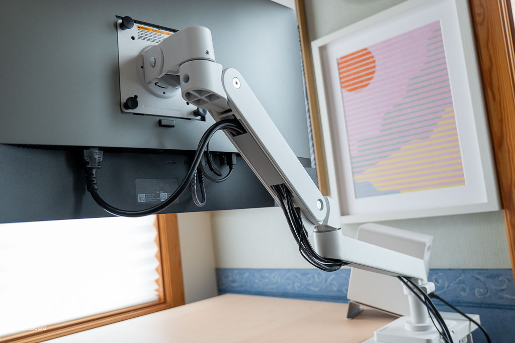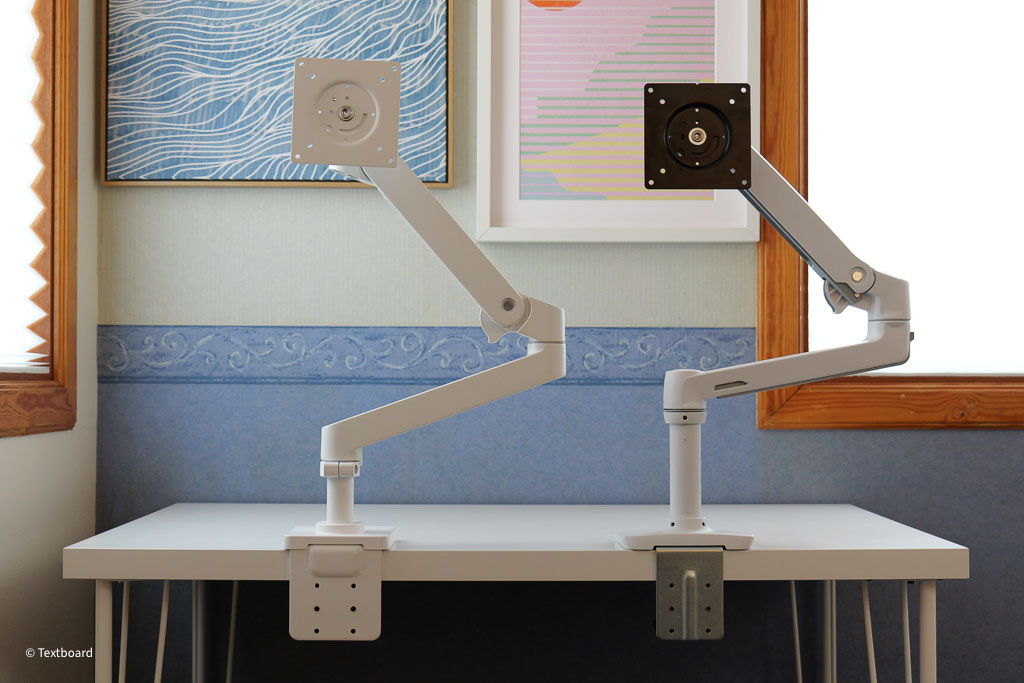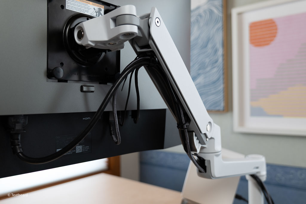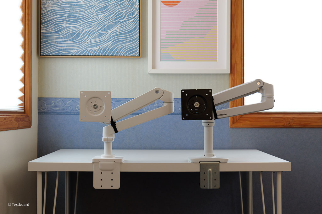 VESAマウントが独立しモニターを取り付けやすく、ケーブル収納が上下のアームにありクランプやVESAクランプなどホワイトカラーが統一されている。