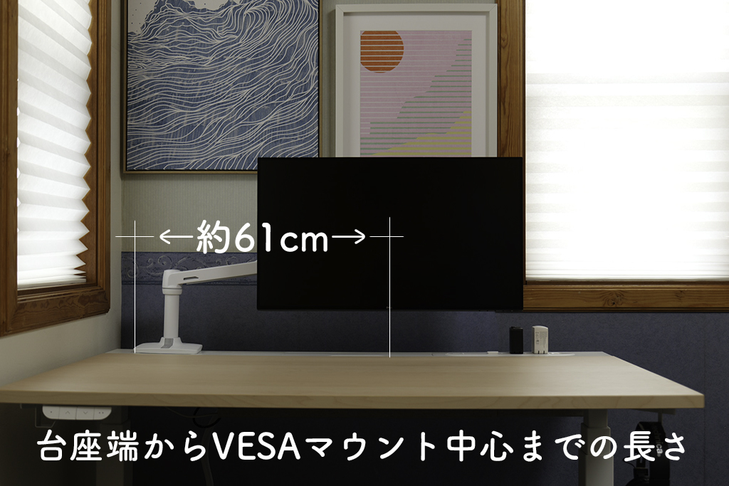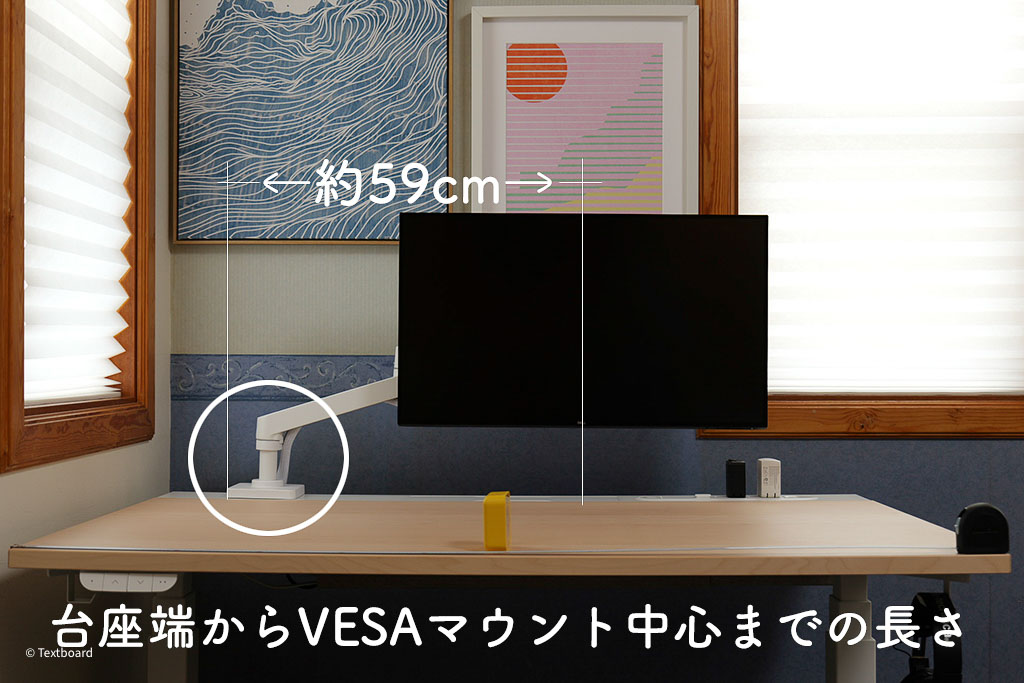 アームを真横に伸ばしきった状態 デスククランプの端からVESA中央まで約59cm。