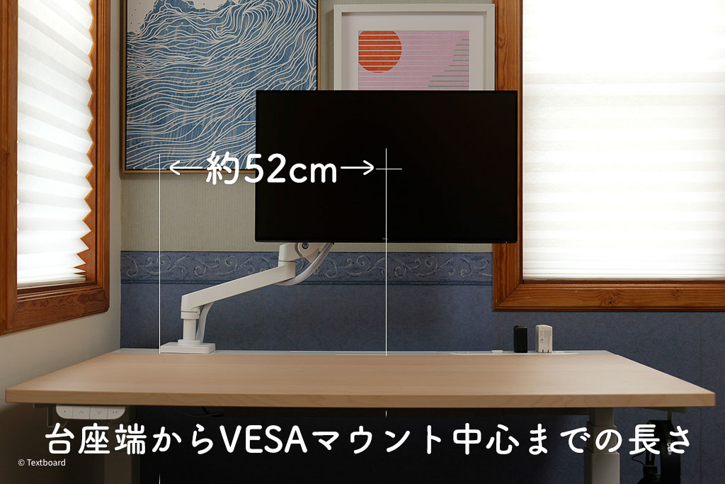 上アームが一番高い状態 デスククランプの端からVESA中心約52cm。