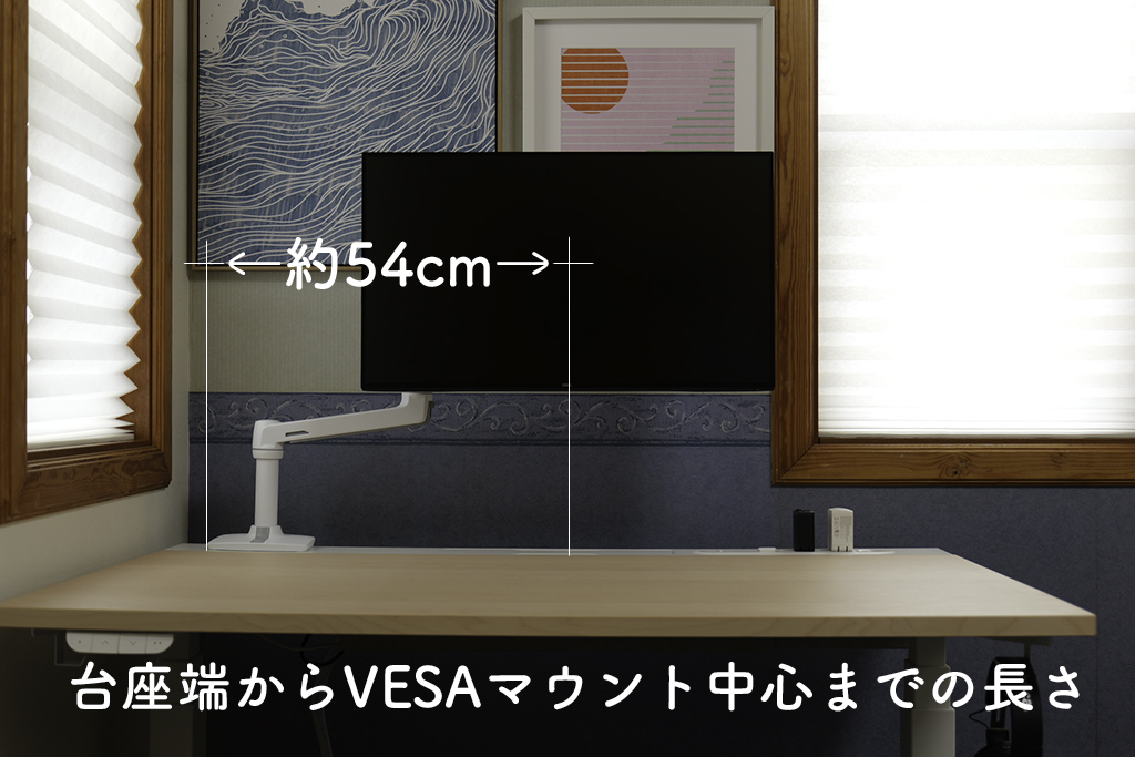 上アームを一番高い位置で固定 デスククランプの端からVESA中心約54cm。