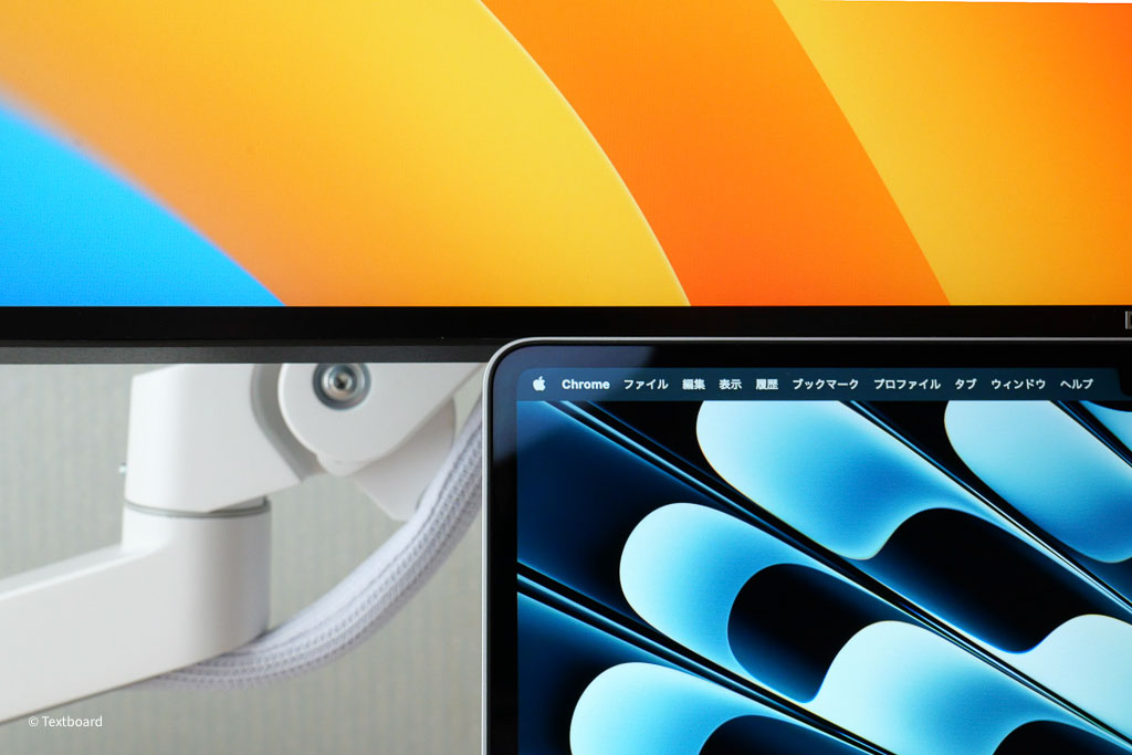 私と同じようにMacBook Airをノートパソコンスタンド(高さ5.5cm)を使用している場合、新型旧型両方とも27インチモニターだとノートPCが被ってしまう。デスクトップPCやクラムシェルモードで使う場合は関係ないですが。