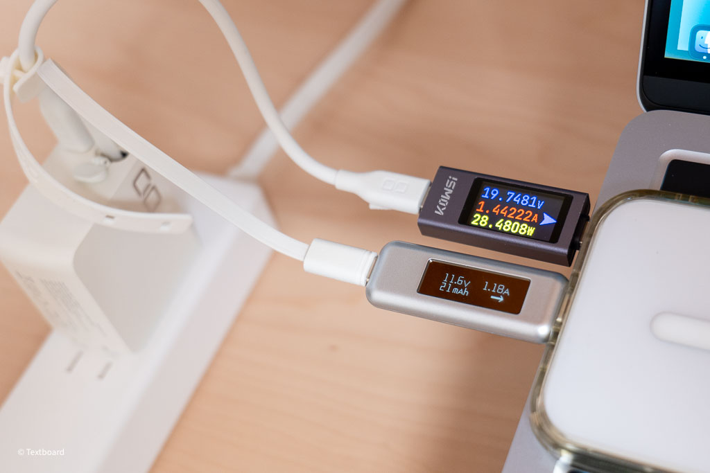 MacBook AirとiPhone16 Proで電力振り分けテストをしました。MacBookでは28W-29W、iPhone16 Proでは13.6W-14Wほど出ていました。ほぼスペック通りです。