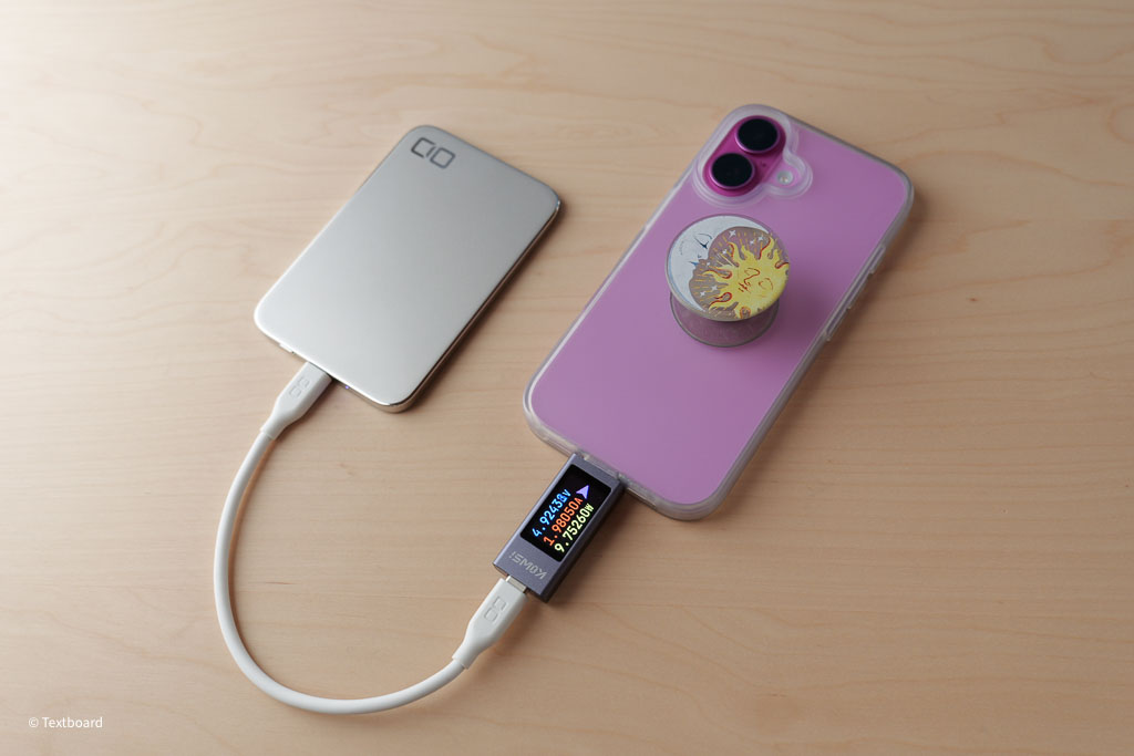 パススルーにも対応し、パススルー使用時の充電器からの入力が最大約20W。iPhoneで試すとiPhone側の制御か分からないが充電器からモバイルバッテリーへの出力は14Wほどでした。