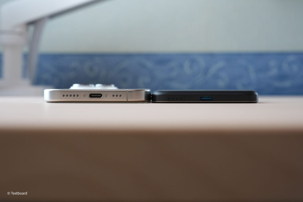 iPhone 16 Proの厚みは8.25mm、ANKER Nano Power Bankは8.6mm、数値ではiPhoneの方が薄いが液晶に保護フィルムを貼っているため厚い。