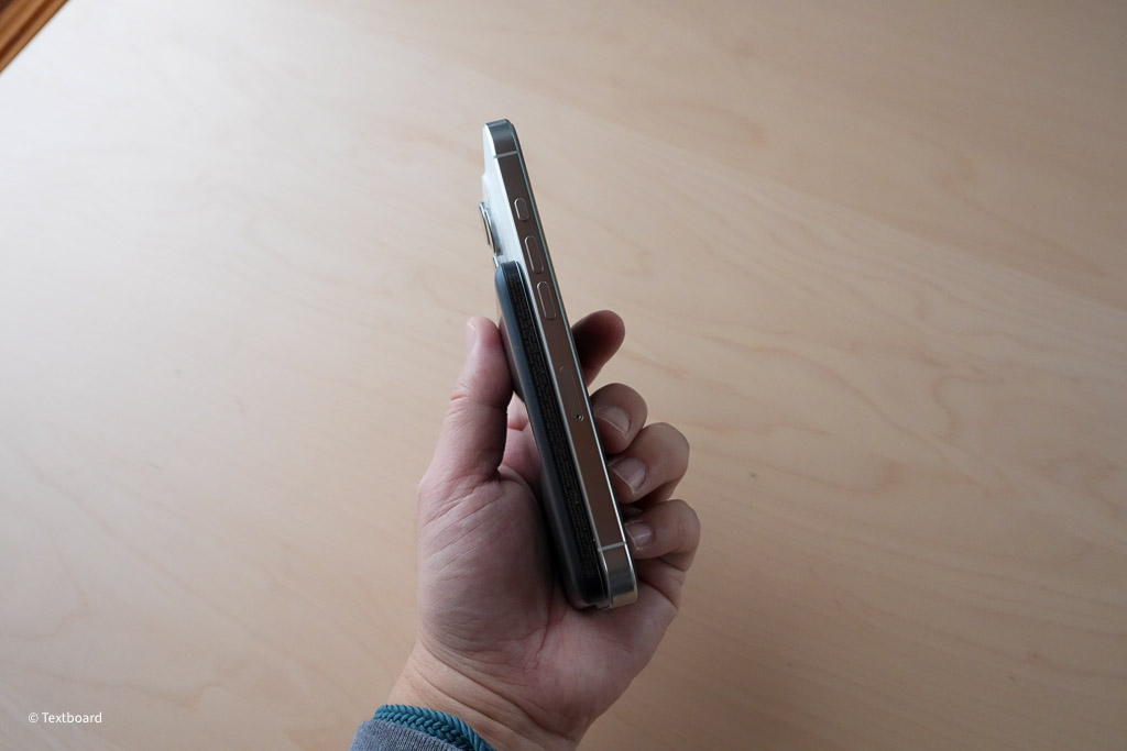 スマホと同時に持ってみても薄くストレスにならない。重量も110グラムと軽い。