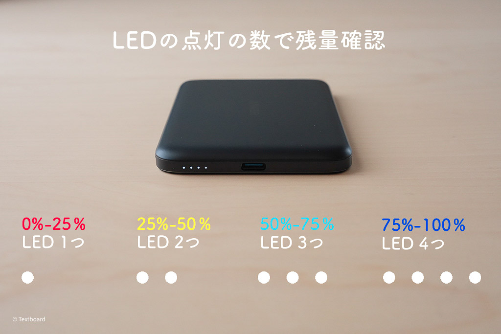残量はLED4つから確認する仕様になっている。最後の0%-25%になるとLED一つになりモバイルバッテリーの充電が0%になる最後は点滅し、最後は消灯し0%になる。