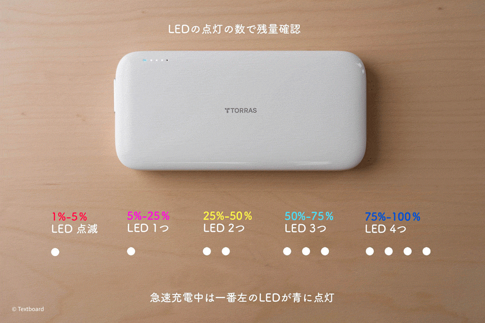残量はLEDの数で確認するタイプです。慣れればぱっと見で分かる、また急速充電中は一番左の楕円形のLEDが青色に点灯する。