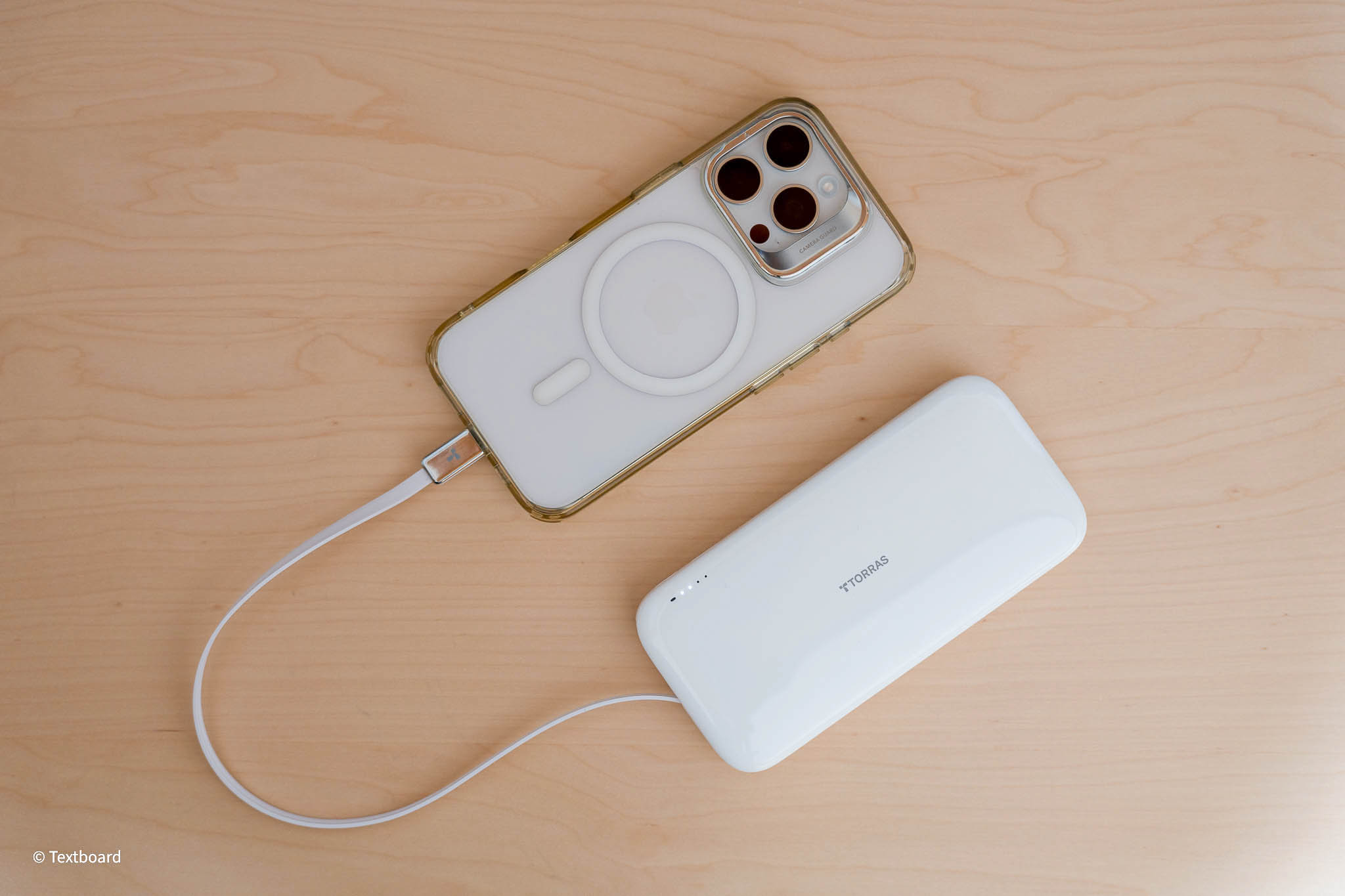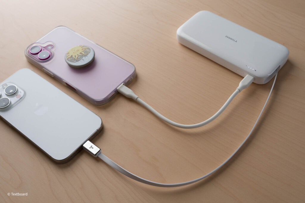 TORRAS FlexLine 巻取り式モバイルバッテリーの最大のメリットは、1台を充電しながら快適な操作性、スマホと一緒に持たなくていい、デスクに置く、バッグに入れた状態でケーブルだけ引き出して使うなど。