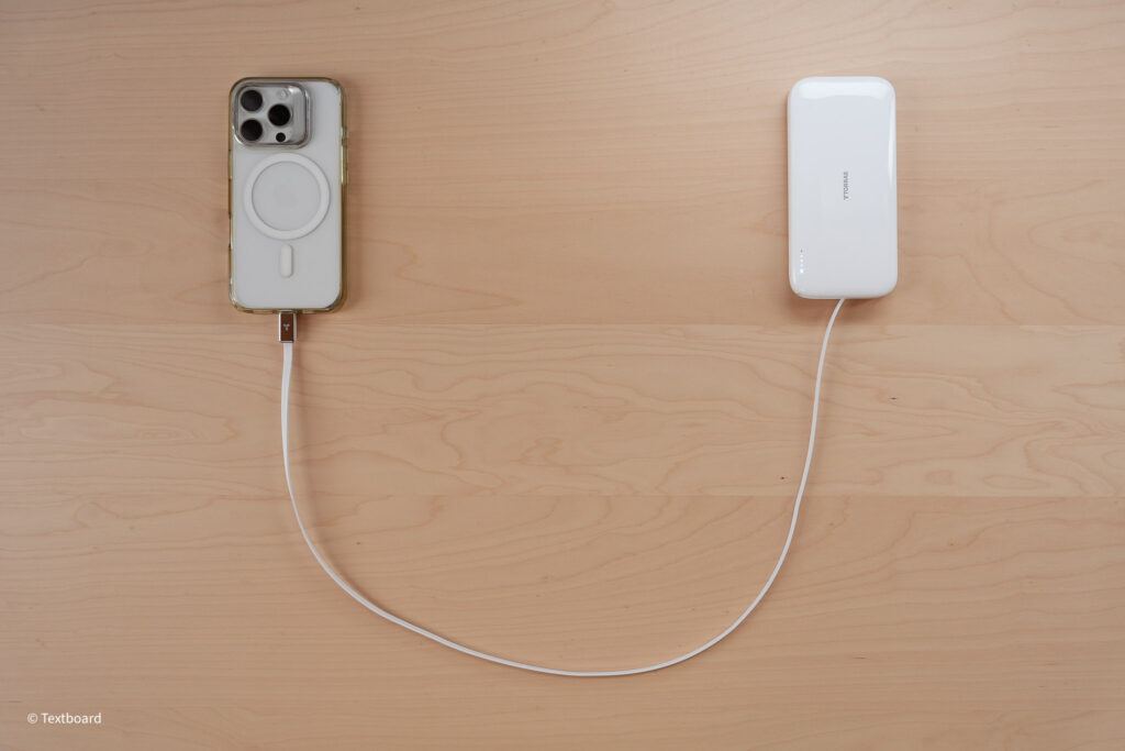 モバイルバッテリー本体は艶のある表面で、手に持っても滑りづらい。巻き取り式ケーブルがモバイルバッテリー本体への充電も対応しているため、充電器にUSBCポートがあれば別途ケーブルは必要ないのでごちゃつかない。