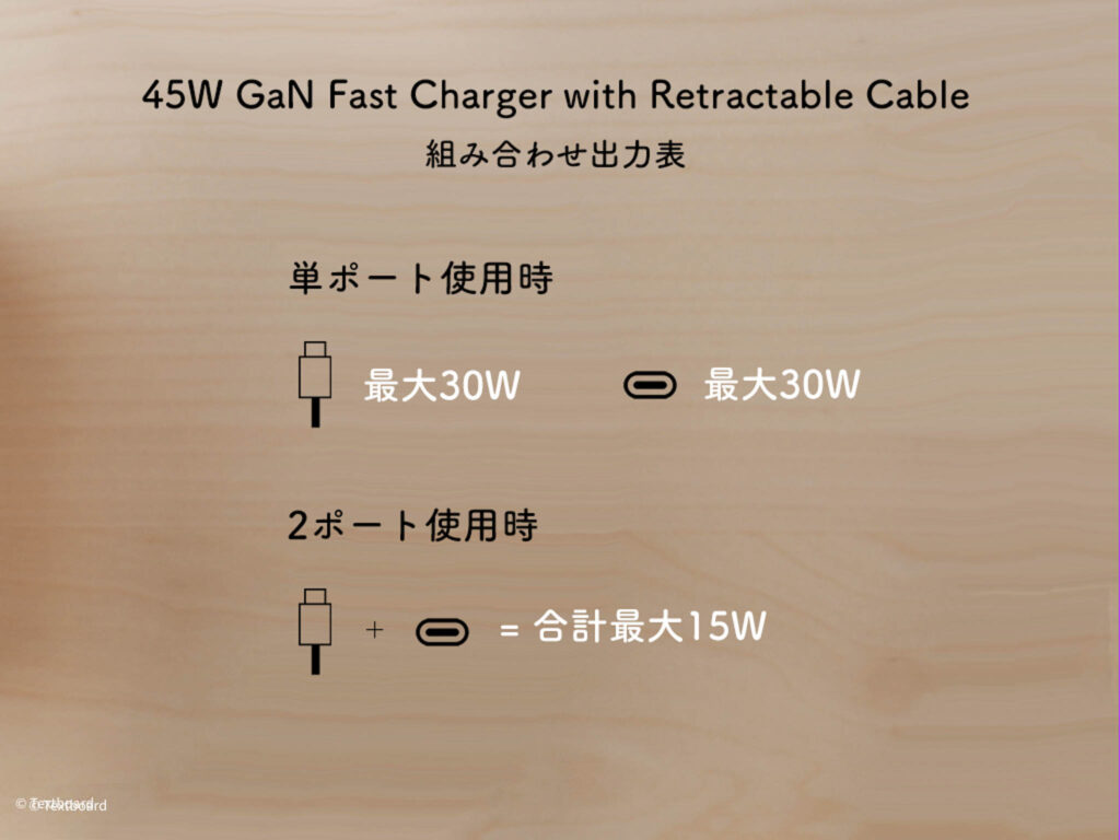 | USB-C / USB-C ケーブル出力 | 5.0V⎓3.0A / 9.0V⎓3.0A / 12.0V⎓2.5A / 15.0V⎓2.0A |