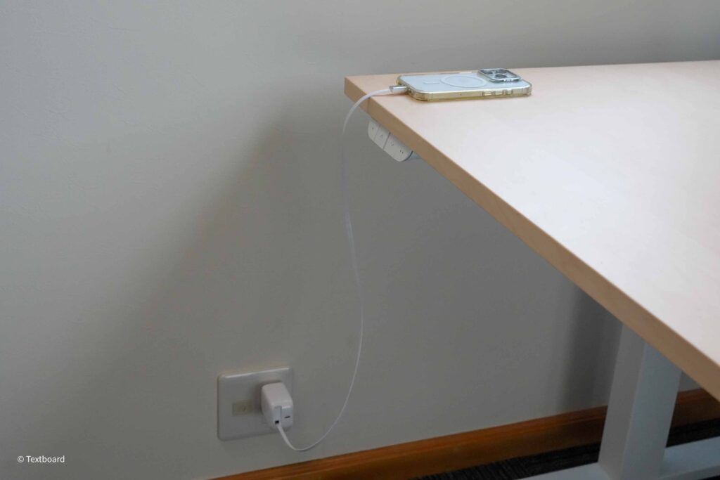 ケーブルの長さは使い方によっては物足りないだろう。上写真はよくある壁コンセントを使用しデスク(高さ72cm)にスマホを置いている状態ですが、見てわかる通りケーブルの余裕があまりない。PCチェアに座った状態で充電しながら使うには、ケーブルが短い。
