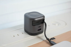 巻き取り式ケーブルが内蔵された充電器、最大出力40Wで最大同時充電は2台まで。電源タップなど種類によっては充電器の大きさで、プラグ差込口が干渉するのでチェックが必要。